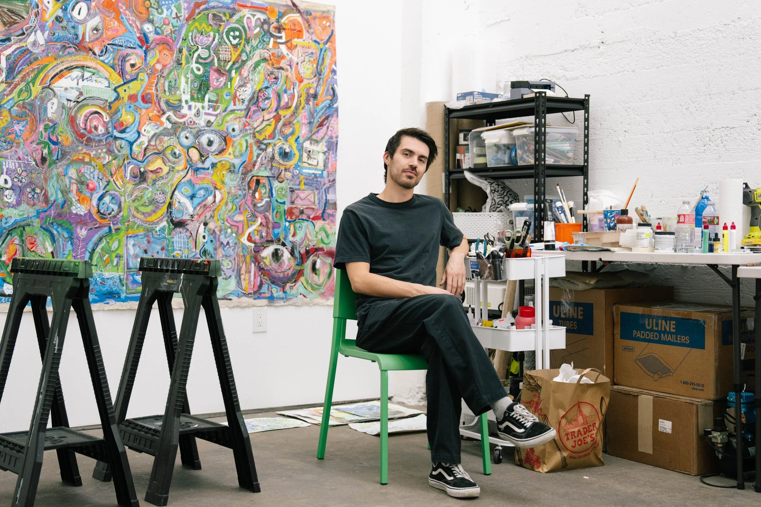 Building networks of patterns and repeating symbols that span physical and digital mediums. Works encompass drawings, paintings, new technologies, and mixed-media surfaces where they mimic the sprawl of online life, touching upon identity, memory, and connection.