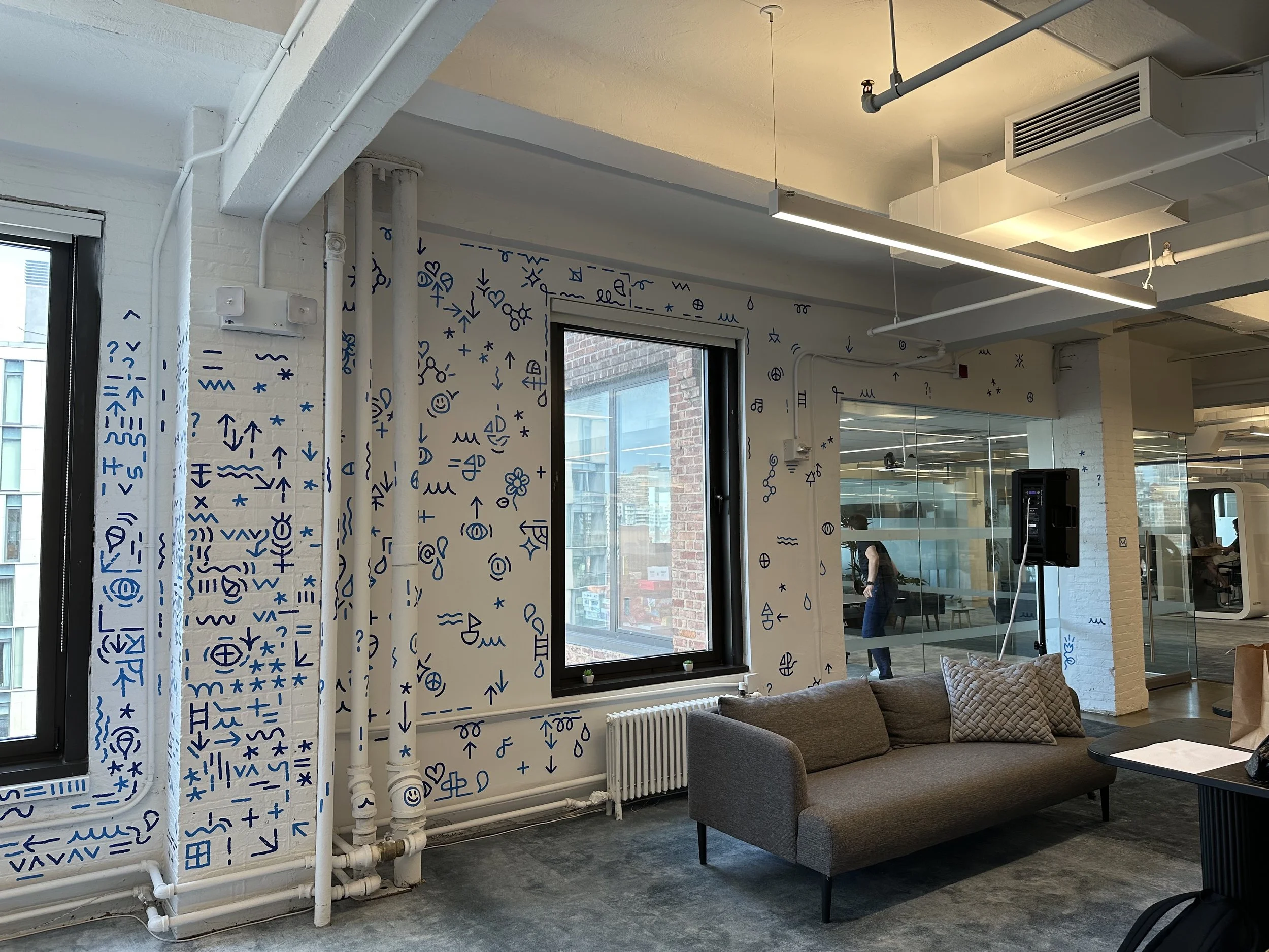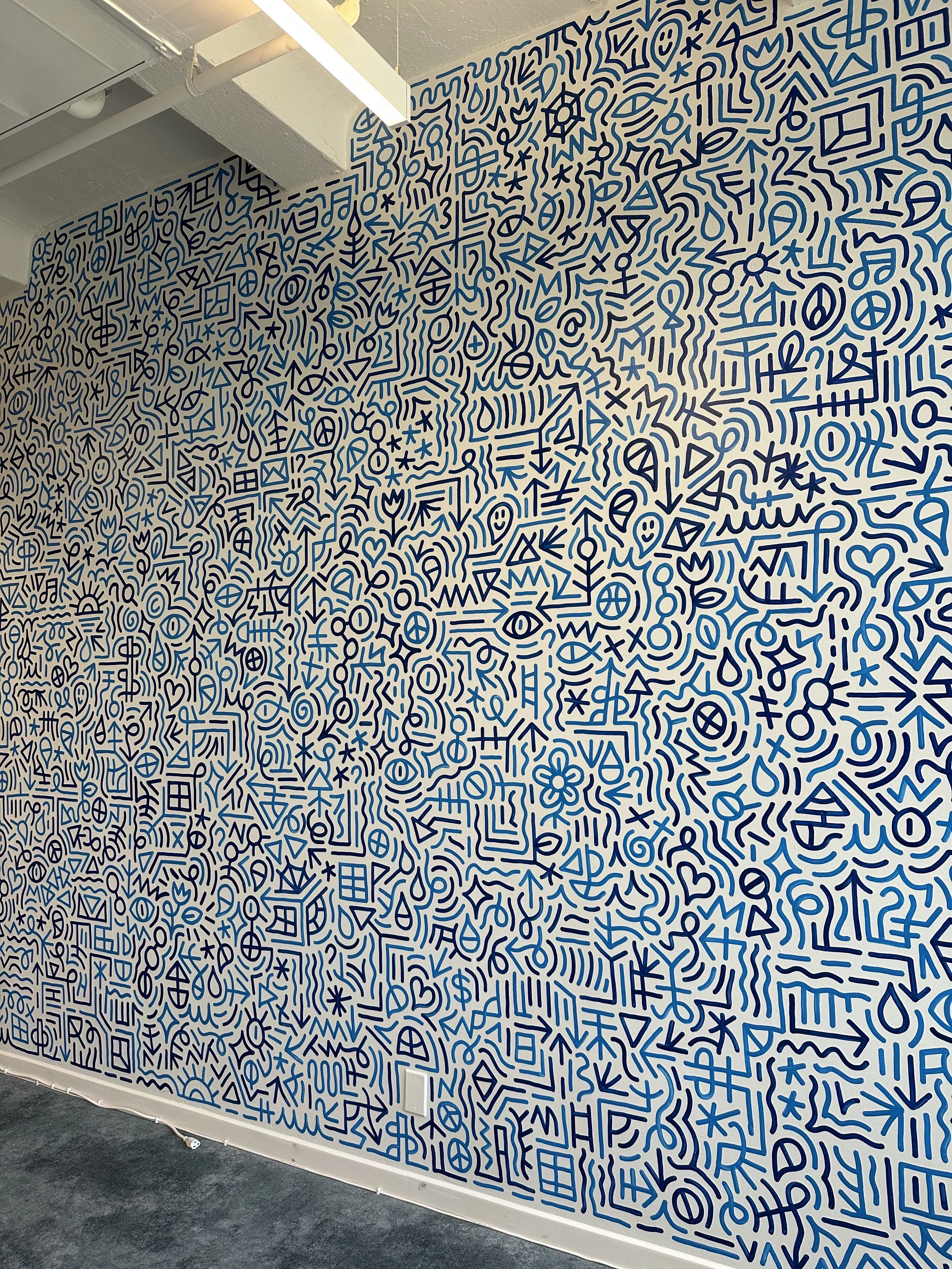 Commissioned for OpenSea's New York office as part of an ongoing collaboration, this mural transforms the interior corner of the office into a visual journey from simplicity to complexity. On the right side it begins with a single shape than expands outward and to the left with multiplying forms and connecting patterns. This mural blends the jam-packed compositions with themes directly inspired by OpenSea's identity as the leading digital asset marketplace.